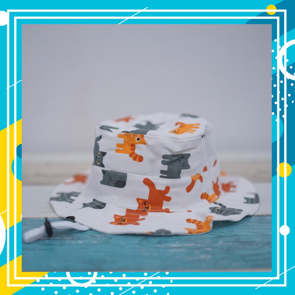 Topi Anak dan Balita | Model Bucket Hat Rimba Kanvas Dengan Tali | Motif Kucing Kucing Lucu warna Putih | Kualitas Kanvas Bahan Premium dan Terbaik | Usia 2 - 10 Tahun